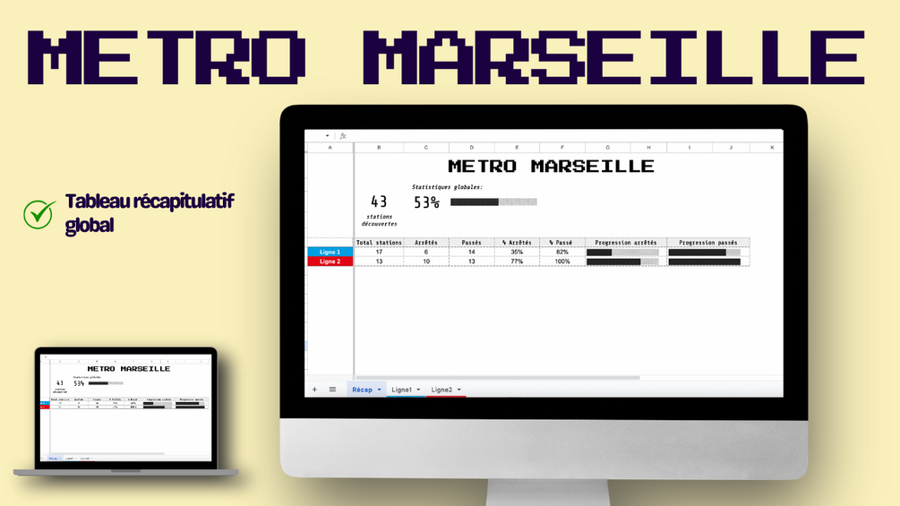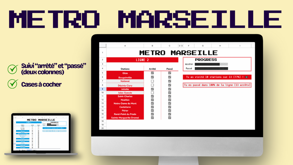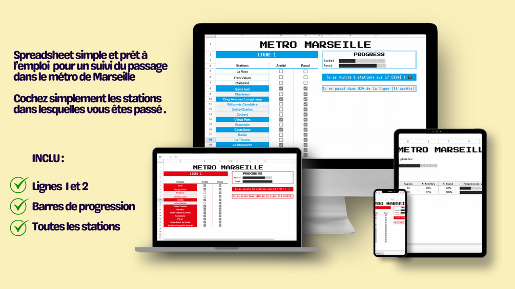 Ce Google Sheet interactif te permet de suivre toutes les stations du métro marseillais avec un système de cases à cocher et des barres de progression ludiques.