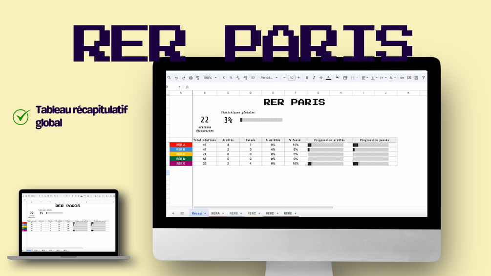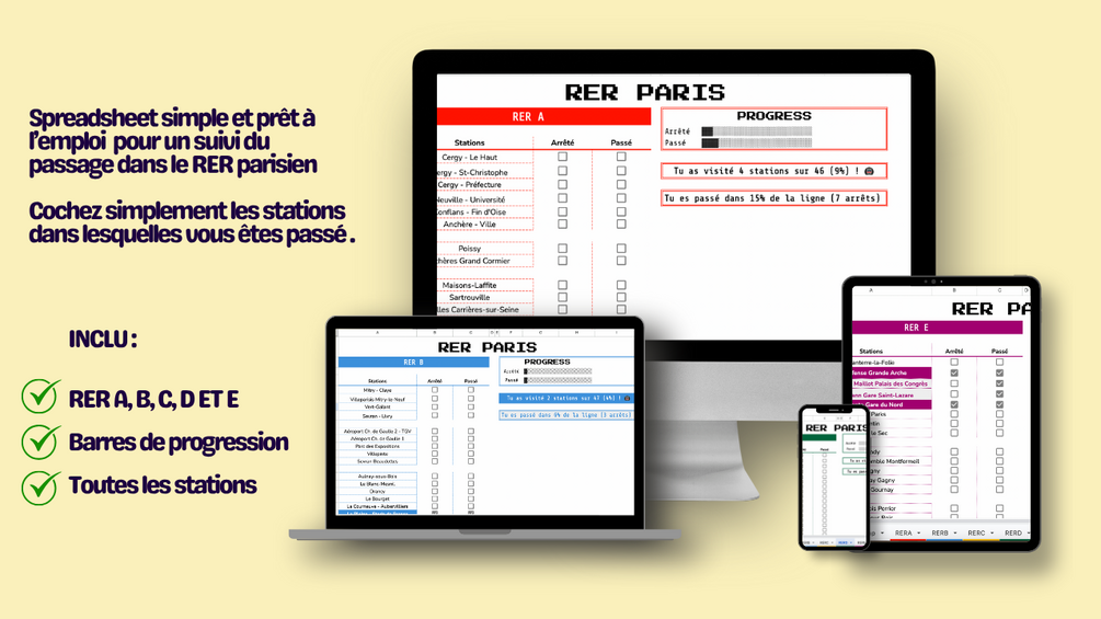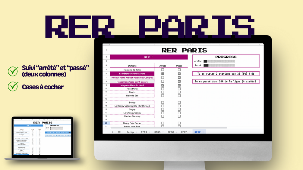 Ce Google Sheet interactif te permet de suivre toutes les stations du RER parisien avec un systĂšme de cases Ă cocher et des barres de progression ludiques.